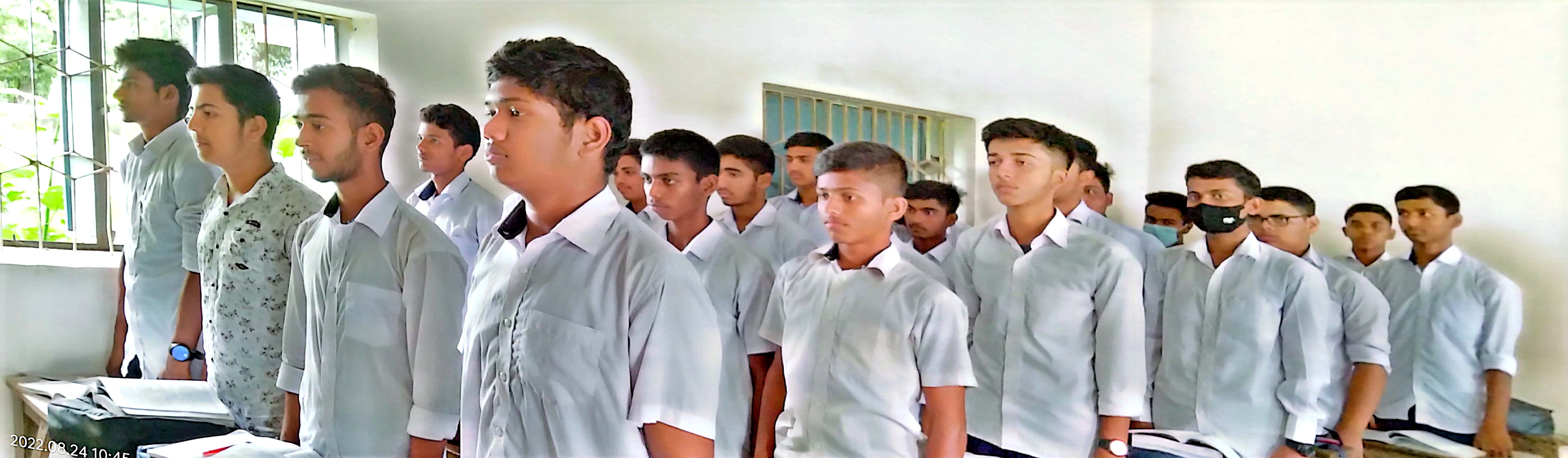 বর্ষা মৌসুমে খোলা মাঠ অনুপযোগী থাকলে শ্রেণিকক্ষে জাতীয় সংগীত পরিবেশন করা হয়। উপরের ছবিতে ১০ম(ক) গ্রুপের ছাত্ররা।