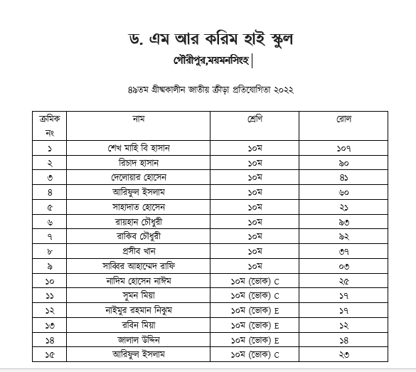 ৪৯তম গ্রীষ্মকালীন জাতীয় ক্রীড়া প্রতিযোগিতা জন্য ড এম আর করিম হাই স্কুলে গঠিত ফুটবল দলের ছবিসহ নামের তালিকা ব্লগে আপলোড করা হলো।