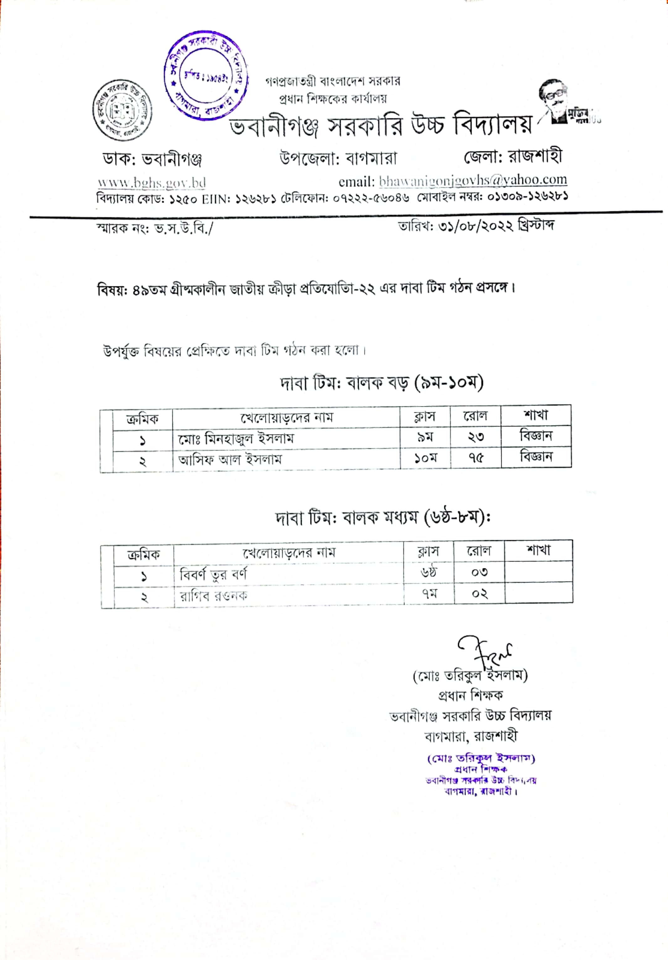 ভবানীগঞ্জ সরকারি উচ্চ বিদ্যালয়, বাগমারা, রাজশাহী এর ৪৯ তম গ্রীষ্মকালীন জাতীয় ক্রীড়া প্রতিযোগিতা -২২ এর দাবা দল