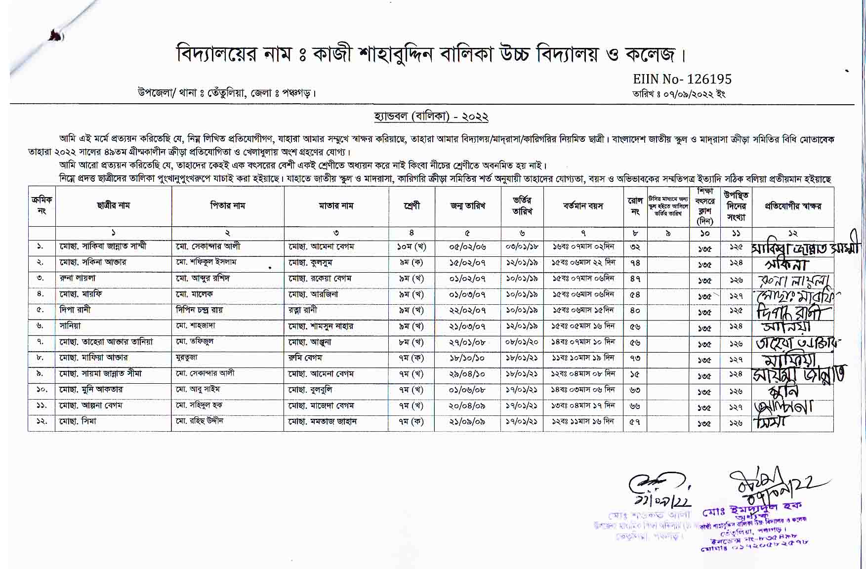 কাজী শাহাবুদ্দিন বালিকা উচ্চ বিদ্যালয় ও কলেজ, তেঁতুলিয়া, পঞ্চগড় হ্যান্ডবল বালিকা দলের নামের তালিকা