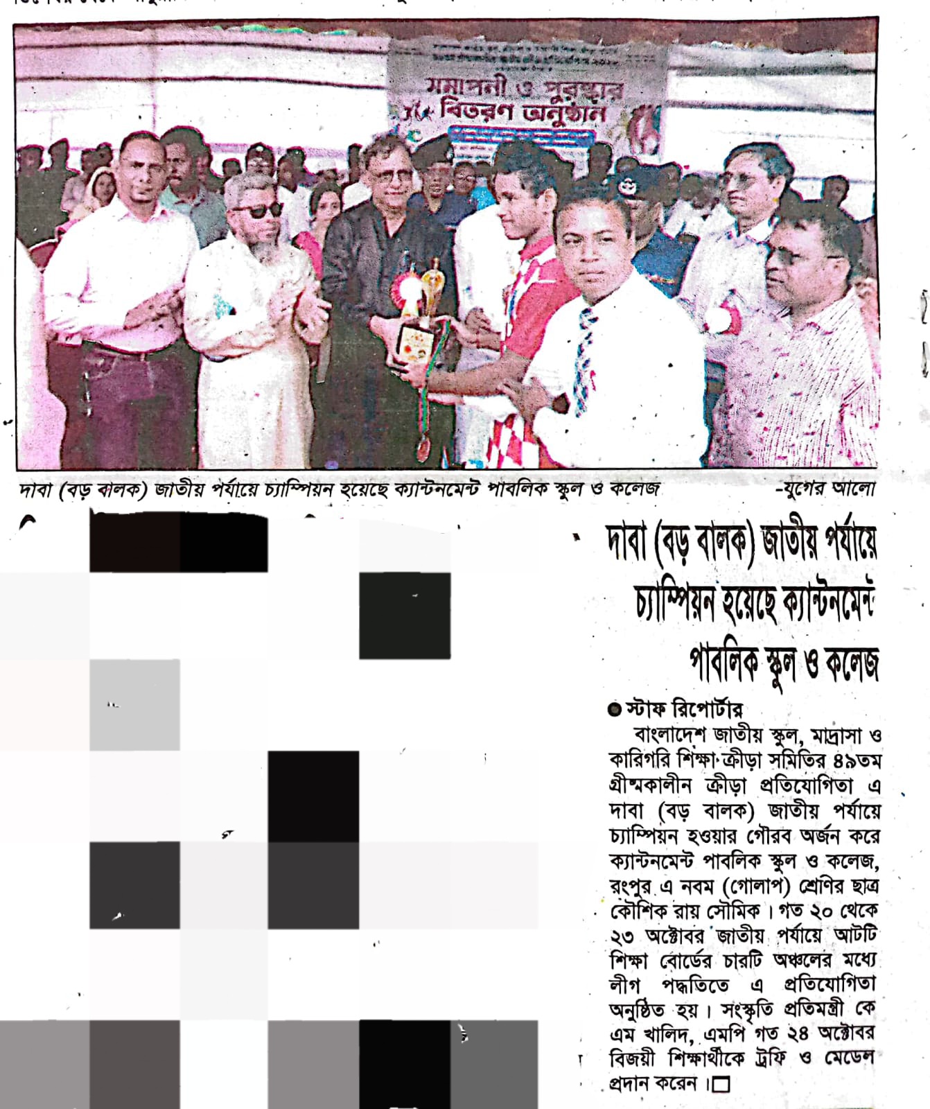 দাবা(বড় বালক) জাতীয় পর্যায়ে চ্যাম্পিয়ন হয়েছে ক্যান্টনমেন্ট পাবলিক স্কুল ও কলেজ,রংপুর।